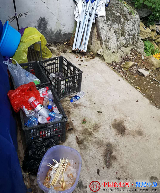 在老君山半山腰的景源饭庄处,近百位游客在此休息停留,多数游客开始就餐,媒体发现,在饭庄右侧有一厕所,厕所左边装有一水管,地上垃圾遍地,饭庄员工就在此刷碗,洗筷子,洗完的碗筷杂乱放在塑料筐内。